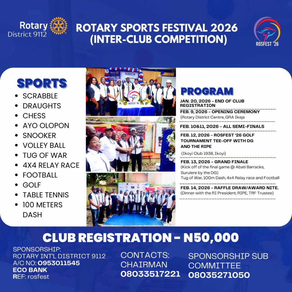 Welcome ROSFEST ’26 ROSFEST ’26 ROSFEST ’26 January 3, 2026 ROSFEST ’26 Rosfest 26 Opening Ceremony ROSFEST ’26 ROSFEST ’26 ROSFEST ’25 ROSFEST ’25 AMBASSADORS AND PILLARS OF SPORTS ’25 ROSFEST ’25 ROSFEST ’25 Games ’25 ROSFEST ’25 GAMES ROSFEST ’24 Inanugration of the Rosfest ’24 committee August 3, 2023 Lighting of Rosfest Torch ’24 Media briefing ’24 Opening Ceremony Games ’24 Rosfest Grand Finale 2023/24 held on March 8th 2024 at Onikan stadium, Lagos ROTARY SPORTS FESTIVAL, HOW IT ALL BEGAN Rosfest ’24 Award and Dinner Night Winners of 2024 rosfest plots of land Thank you to our 2023/24 sponsors Golf tournament ‘ 24 CHESS ’24